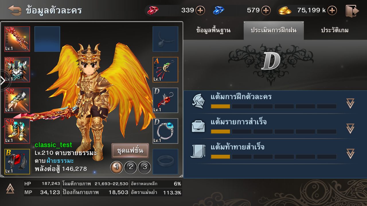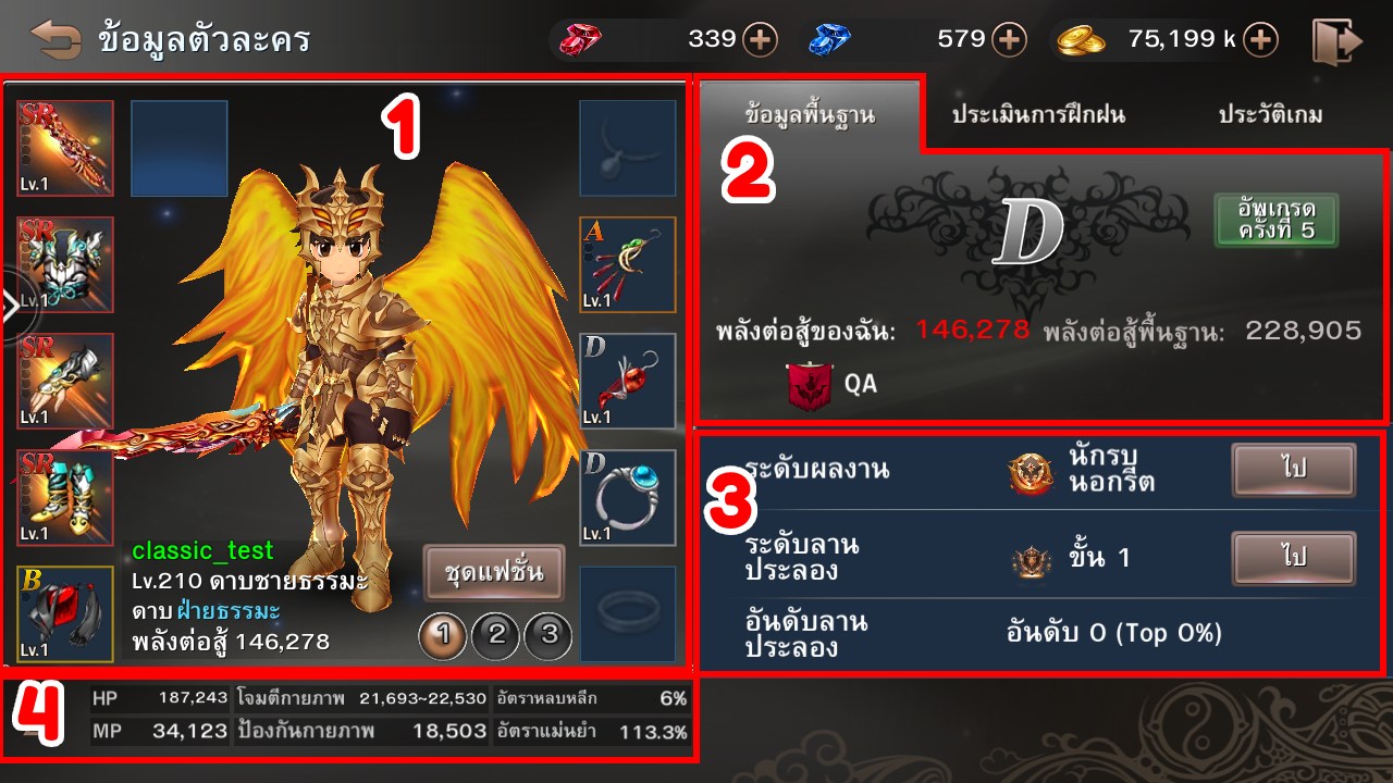 4. ข้อมูลตัวละครโดยละเอียด (สามารถกดปุ่มลูกศรด้านข้างเพื่อแสดงข้อมูลสเตตัสตัวละครโดยละเอียดได้)