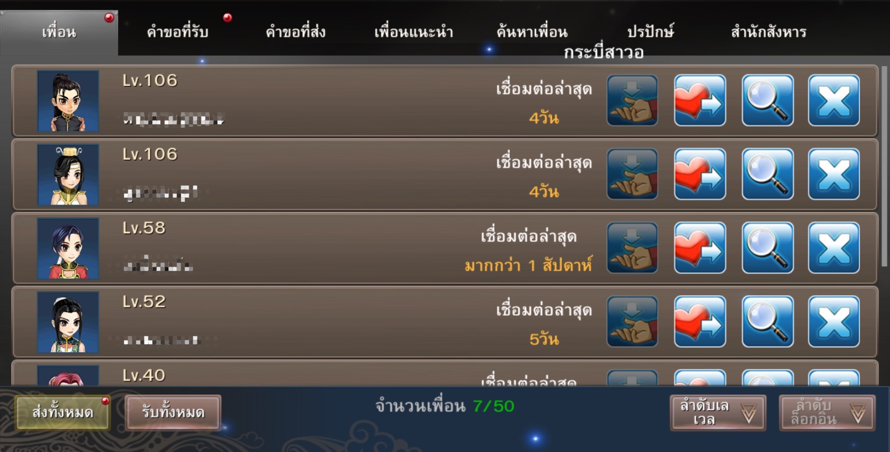 - คำขอที่รับ : เป็นการตรวจสอบว่ามีผู้เล่นคนที่ต้องการเป็นเพื่อนกับเรา