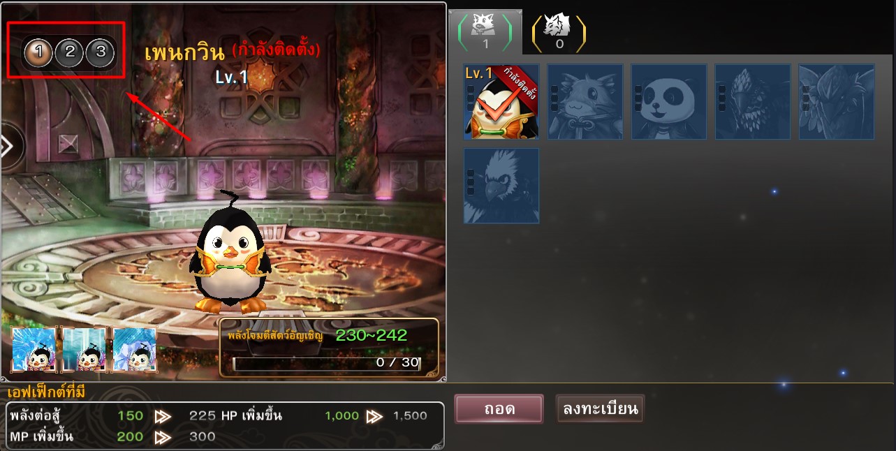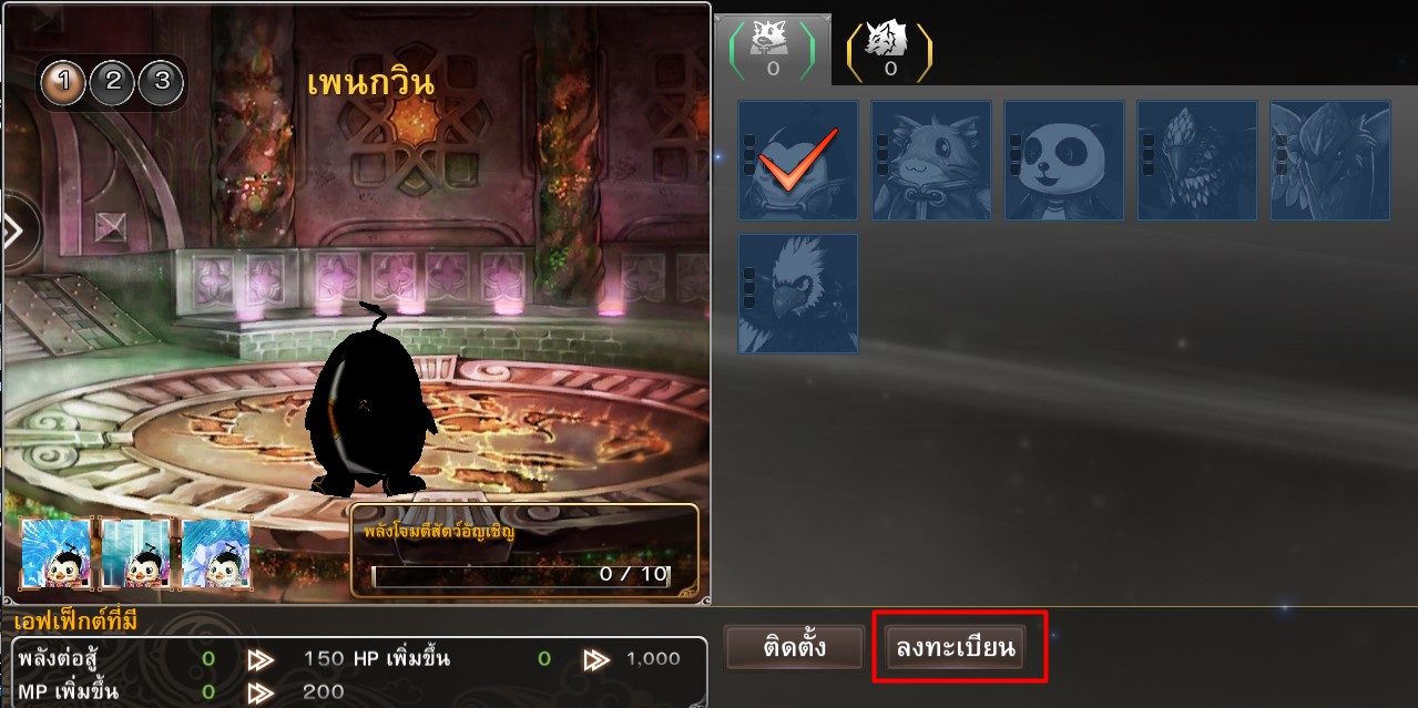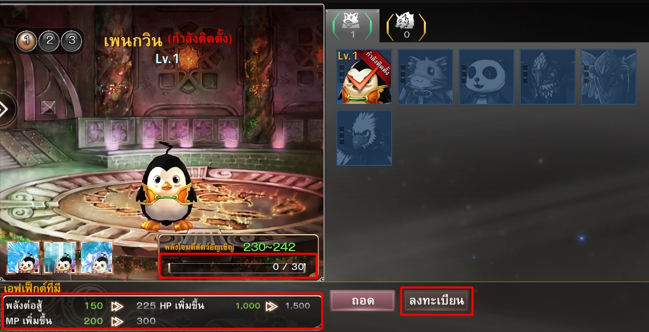 ใช้ชิ้นส่วนสัตว์อัญเชิญในการเพิ่มพลังโจมตีและป้องกัน ด้วยการกด “ลงทะเบียน” จดหลอดเต็ม ระบบจะขึ้นหลอดใหม่มาให้ พร้อมกับ Lv. ของสัตว์อัญเชิญที่เพิ่มขึ้น และ เอฟเฟ็กต์พลังที่เพิ่มขึ้น