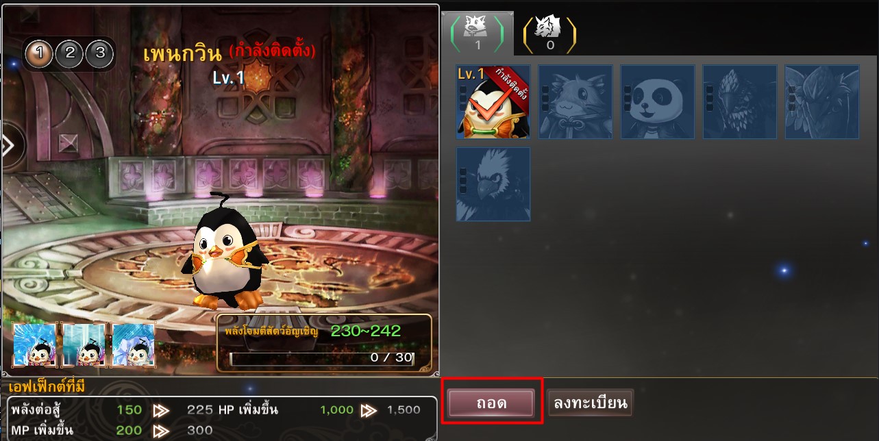ให้ผู้เล่นกดไปที่สัตว์อัญเชิญที่ได้ทำการติดตั้งเอาไว้อยู่ในหน้าสัตว์อัญเชิญ หลังจากนั้นให้กดที่ “ถอด”
