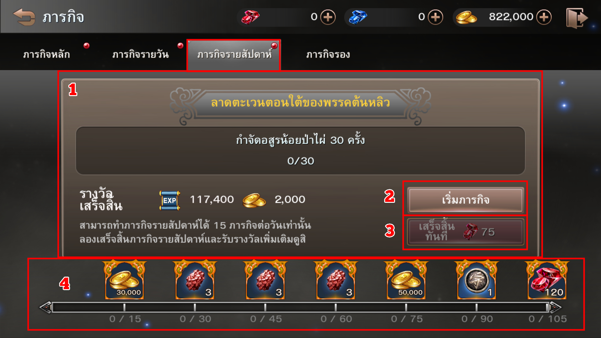 - หลอดแสดงความคืบหน้าในการทำภารกิจรายสัปดาห์และของรางวัล