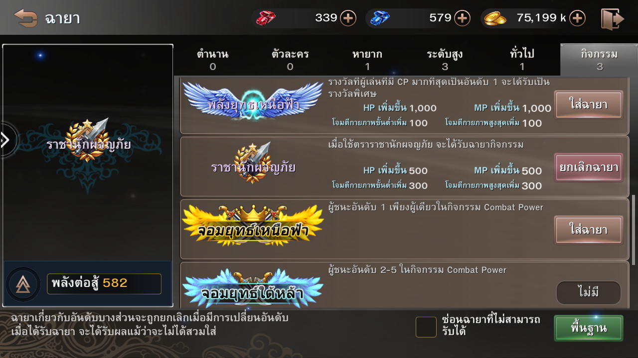และเราก็สามารถเลือกฉายาอะไรก็ได้ที่รับมาแล้วแสดงบนหัวตัวละครเราก็ได้โดยกดปุ่ม “ใส่ฉายา”